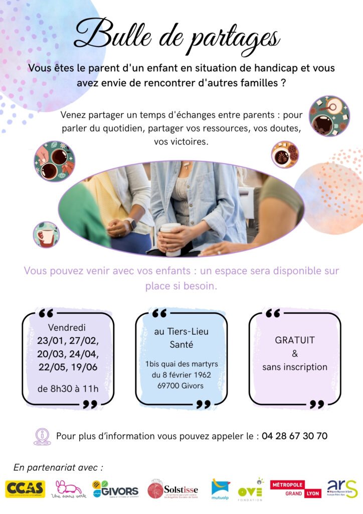 Organisateur Tiers-Lieu Santé Givors Lieu La Salle d'Activités Collectives 1bis quai des Martyrs du 8 février 1962 69700 Givors Catégorie évènements partenairesévènements TLS Prochaine occurence Aller à la Page Date 22 Mai 2026 Heure 8h30 - 11h00 Date 24 Avr 2026 Heure 8h30 - 11h00 Bulle de partage 00 jours 00 heures 00 minutes 00 secondes